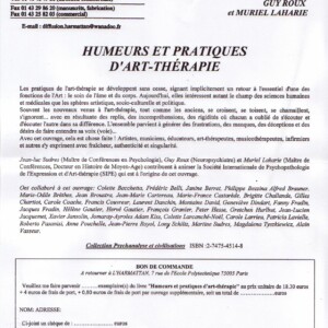 Veuillez me faire parvenir ………exemplaire(s) du livre « Humeurs et pratiques d’art-thérapie » au prix unitaire de 18.30 euros + 4 euros de frais de port, + 0,80 euros de frais de port par ouvrage supplémentaire, soit un total de ……………….euros